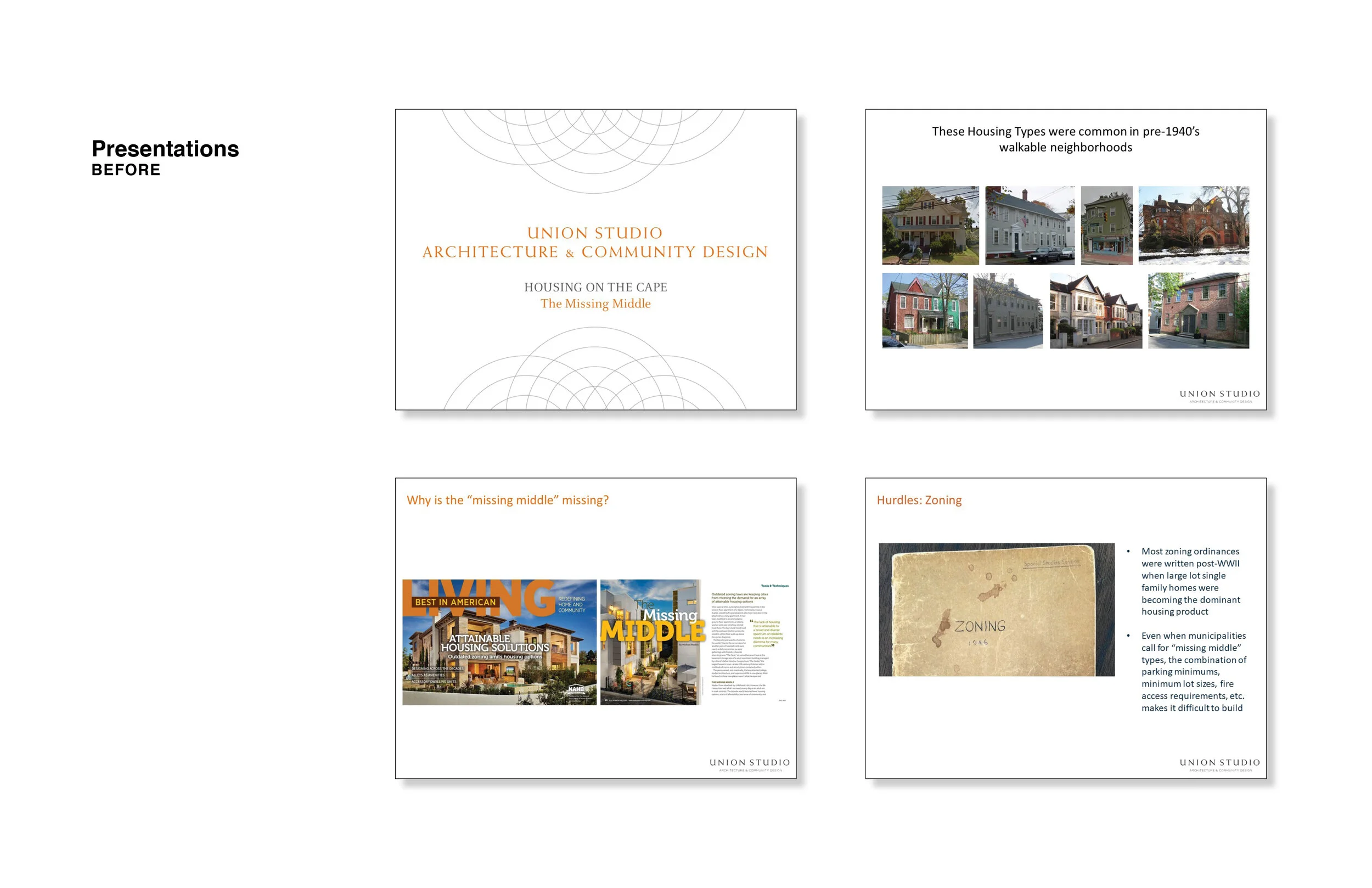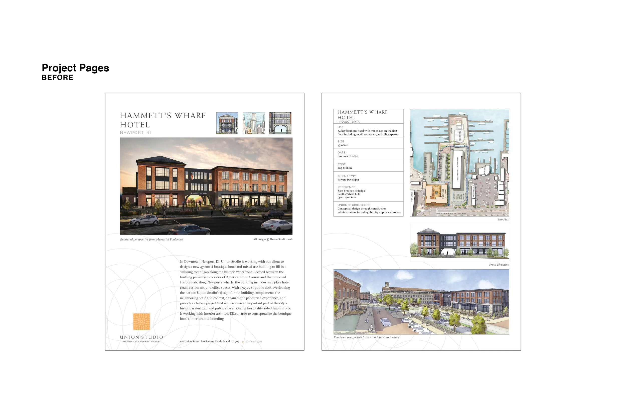 Since the company changed from a single name firm to Union Studio in 2011, the firm's collateral had not been updated. Given that all marketing materials, rfp responses, and external communication used the same layout, updating the appearance and feel of the collateral was one of the top priorities. Based on its intended use, we wanted to give each product a distinct identity.